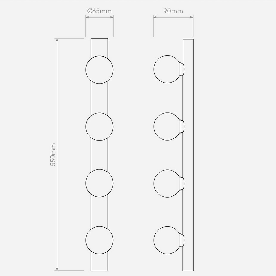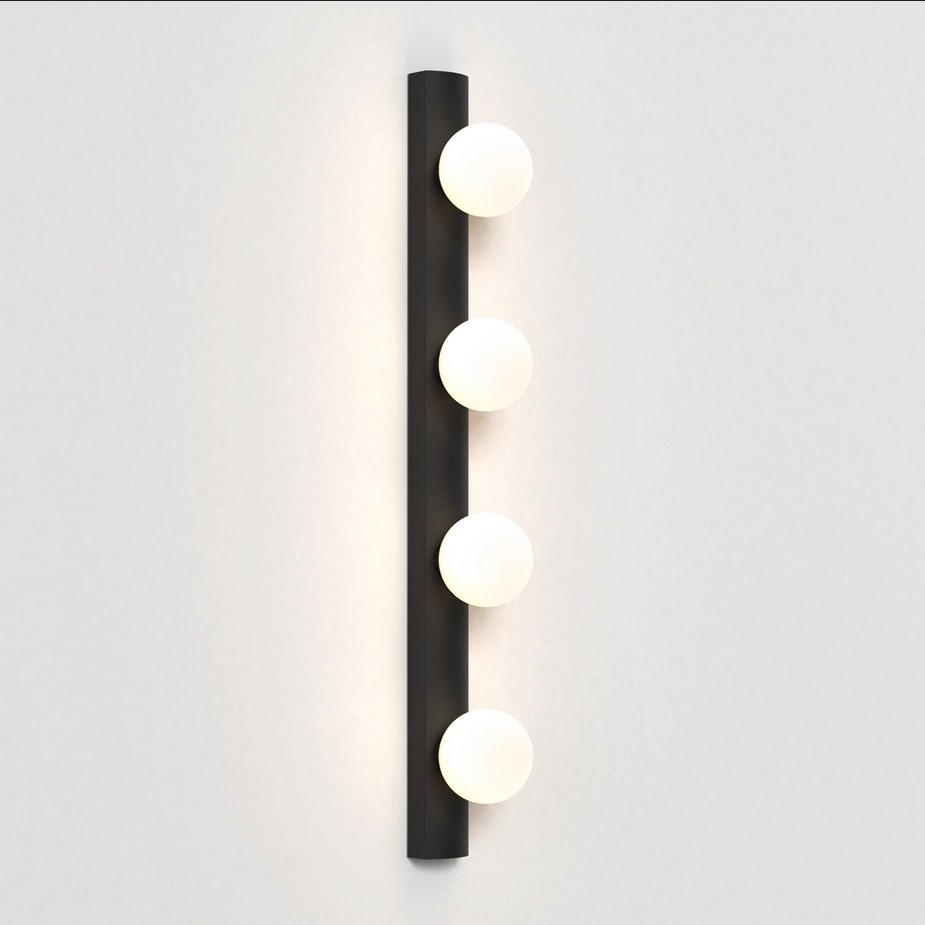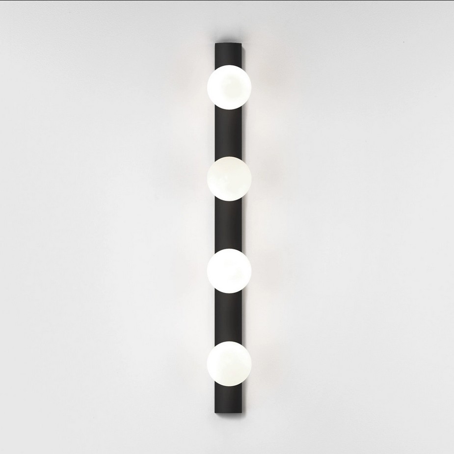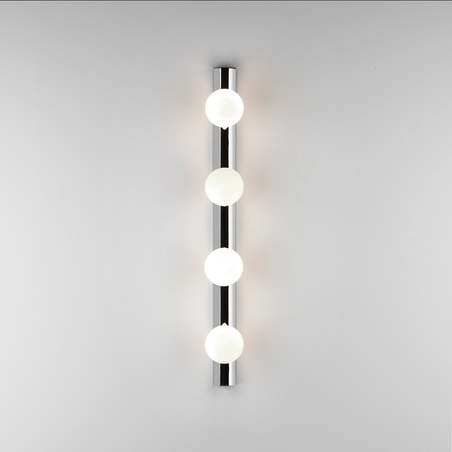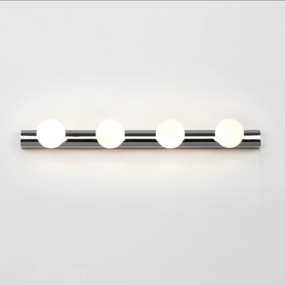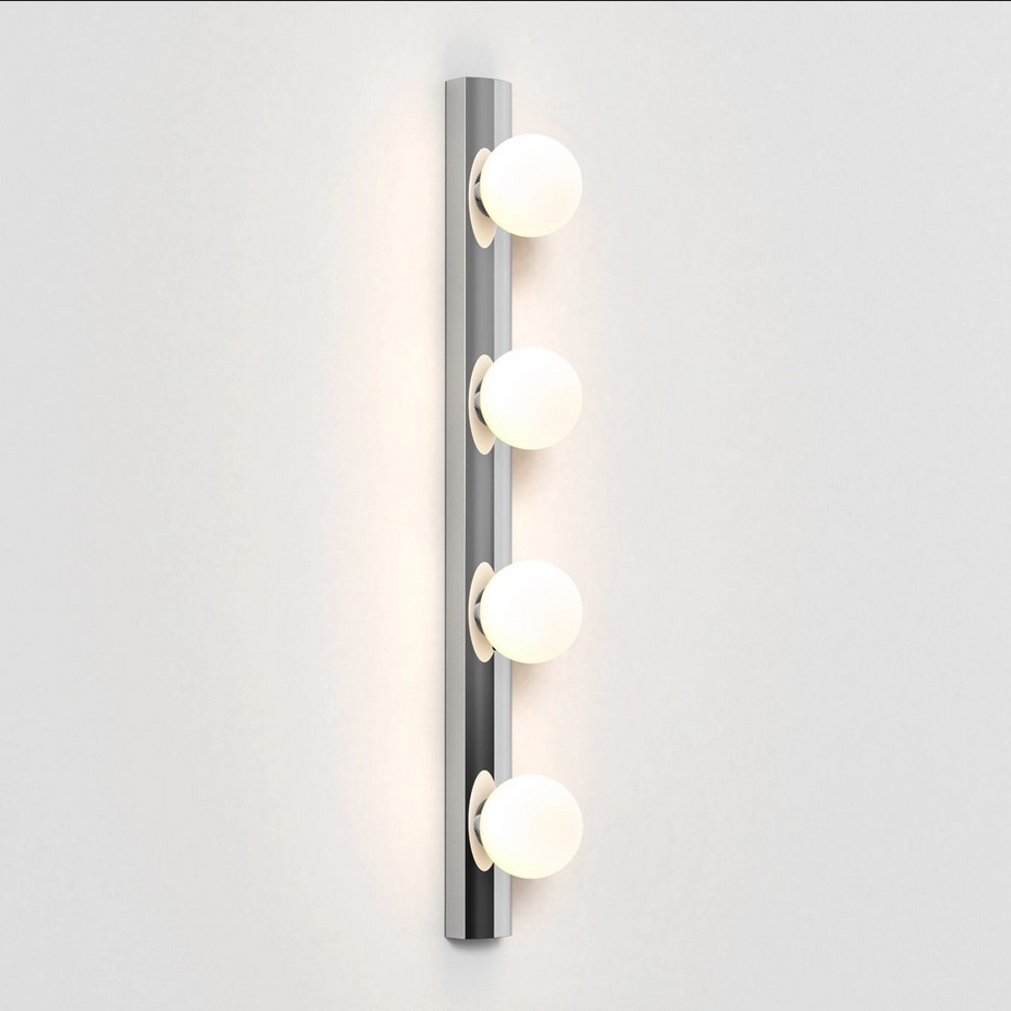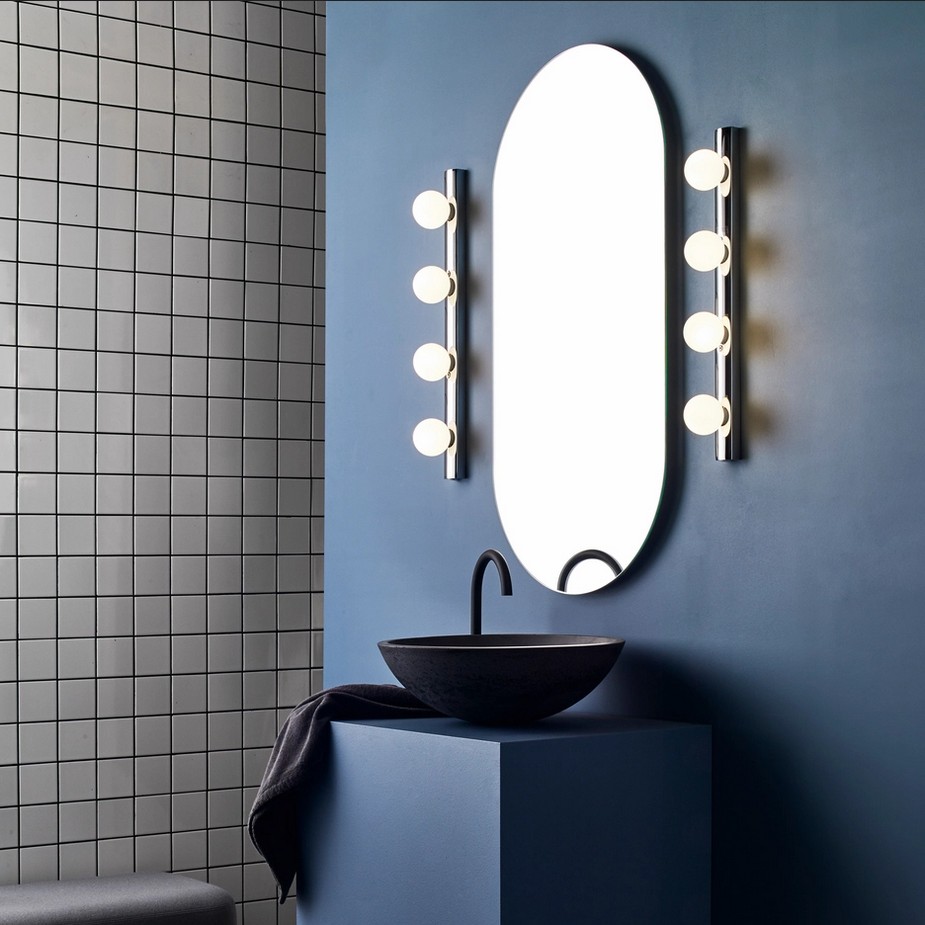 Ta oprawa ścienna to nowoczesna wersja klasycznego hollywoodzkiego lustra ze smukłym korpusem w kolorze polerowanego chromu lub czerni i czterema kulistymi kloszami z dmuchanego szkła, dająca równomierne, jasne oświetlenie. Lampa przeznaczona do łazienek lub przebieralni może być montowana poziomo lub pionowo wokół lustra i jest dostarczana niewłączona, aby gładko wpasować się w zintegrowane plany oświetleniowe.