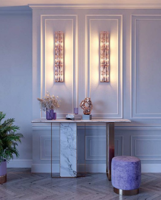 Metalowa oprawa w kolorze złotym. Ozdobny kryształ z architektonicznymi szlifami. W ofercie znajdują się żyrandole sufitowe z 4, 6 lampami oraz kinkiety