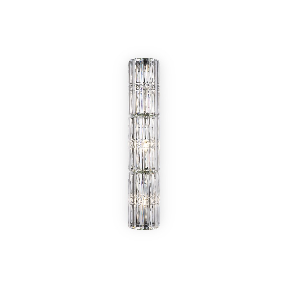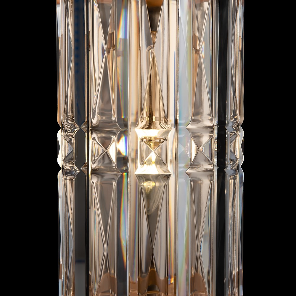 Metalowa oprawa w kolorze złotym. Ozdobny kryształ z architektonicznymi szlifami. W ofercie znajdują się żyrandole sufitowe z 4, 6 lampami oraz kinkiety