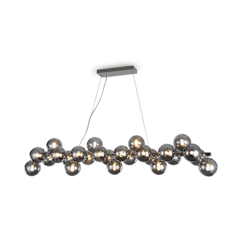 Okucia metalowe w kolorach: czarny mat, czarny, chrom, złoto, mosiądz. Lampy kopułowe — przepalone szkło. Kolory — przydymiony, bursztynowy, koniakowy, matowa biel i czerń. Projekt z symulacją struktury molekularnej. Wysokość lamp wiszących jest regulowana za pomocą linki. Lampa z trzonkiem G9.
