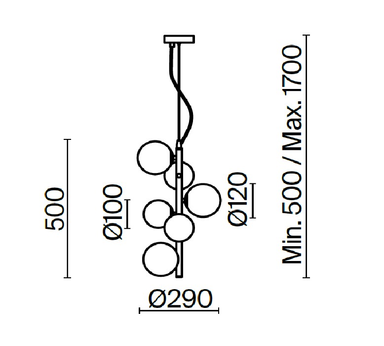 Okucia metalowe w kolorach: czarny mat, czarny, chrom, złoto, mosiądz. Lampy kopułowe — przepalone szkło. Kolory — przydymiony, bursztynowy, koniakowy, matowa biel i czerń. Projekt z symulacją struktury molekularnej. Wysokość lamp wiszących jest regulowana za pomocą linki. Lampa z trzonkiem G9.