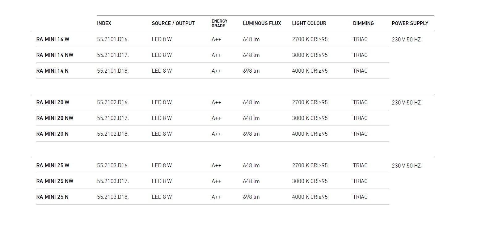Ra Mini to oprawa przeznaczona do montażu na suficie bądź na ścianie. Można stosować ją pojedynczo lub w grupie. Oprawy świecą światłem pośrednim, oświetlając przestrzeń miękko i nastrojowo. Każda zmiana ustawienia talerza wypływa na kierunek padającego światła. Model dostępny jest w wersji z systemem ściemniania TRIAC. Dzięki temu można łatwo dostosować natężenie światła do indywidualnych potrzeb użytkowników. Najlepsze na rynku, selekcjonowane diody dają bezpieczne światło przez wiele lat, a wysoki wskaźnik oddawania barw pozwala cieszyć się we wnętrzu żywymi kolorami, bliskimi naturze. Możesz dobrać do swojego wnętrza barwę światła: