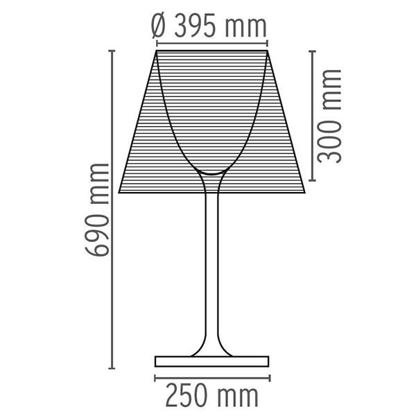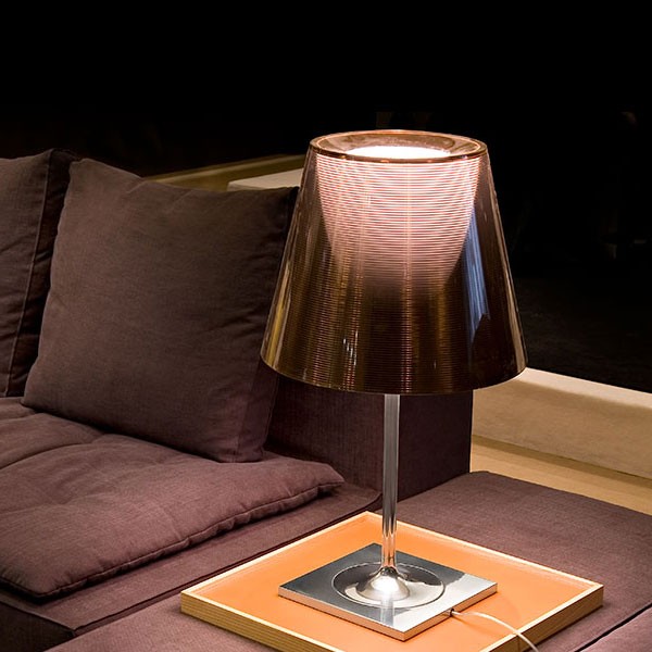 Oprawa stołowa zapewniająca rozproszone oświetlenie. Podstawa, wspornik pręta i wspornik dyfuzora z odlewanego ciśnieniowo, polerowanego i chromowanego stopu znalu. Osłona podstawy z czarnego formowanego wtryskowo PA (nylonu). Opalizowany klosz wewnętrzny z poliwęglanu formowany wtryskowo. Zewnętrzne dyfuzory z przezroczystego lub fumee PMMA (polimetakrylanu metylu) i srebra lub brązu na wewnętrznej powierzchni, przez próżniowe powlekanie aluminium. Formowany wtryskowo górny pierścień z poliwęglanu, całkowicie przezroczysty lub przezroczysty klosz i srebrny klosz) lub przezroczysty brąz na zewnętrzny klosz z brązu.