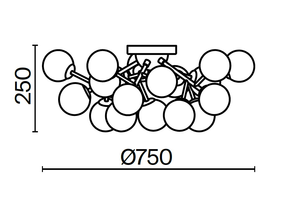 Okucia metalowe w kolorach: czarny mat, czarny, chrom, złoto, mosiądz. Lampy kopułowe — przepalone szkło. Kolory — przydymiony, bursztynowy, koniakowy, matowa biel i czerń. Projekt z symulacją struktury molekularnej. Wysokość lamp wiszących jest regulowana za pomocą linki. Lampa z trzonkiem G9.