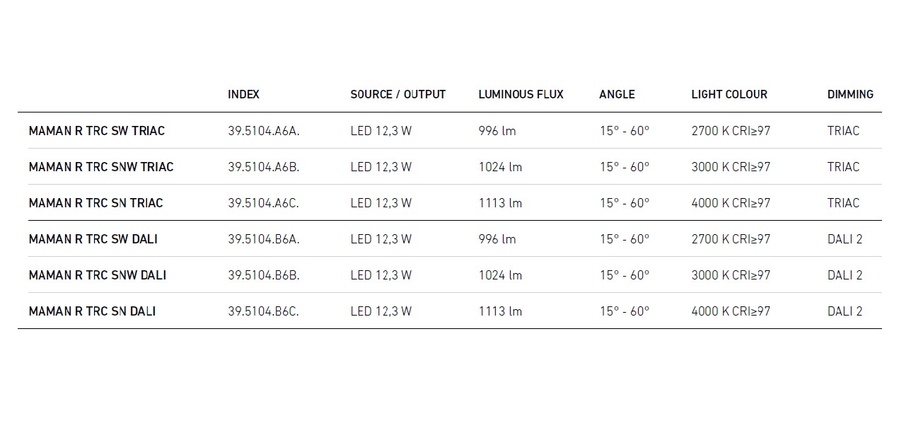 Seria Maman R TRC pozwala na zastosowanie dowolnej ilości opraw w szynoprzewodzie i daje możliwość zmiany aranżacji w dowolnym momencie. Reflektory dostarczane są wraz z adapterem z technologią ściemniania TRIAC albo DALI.